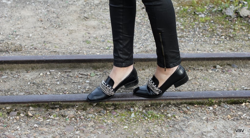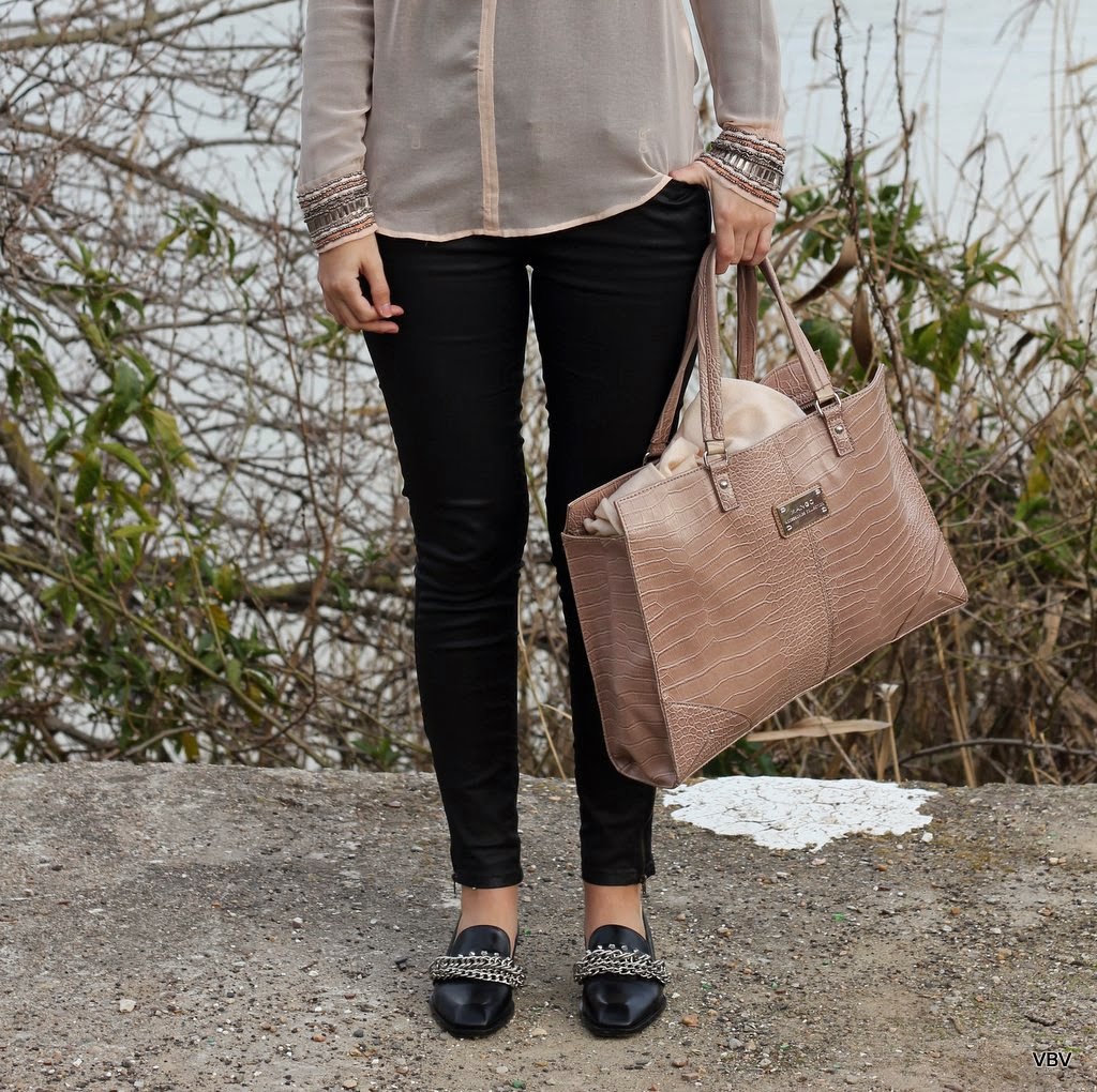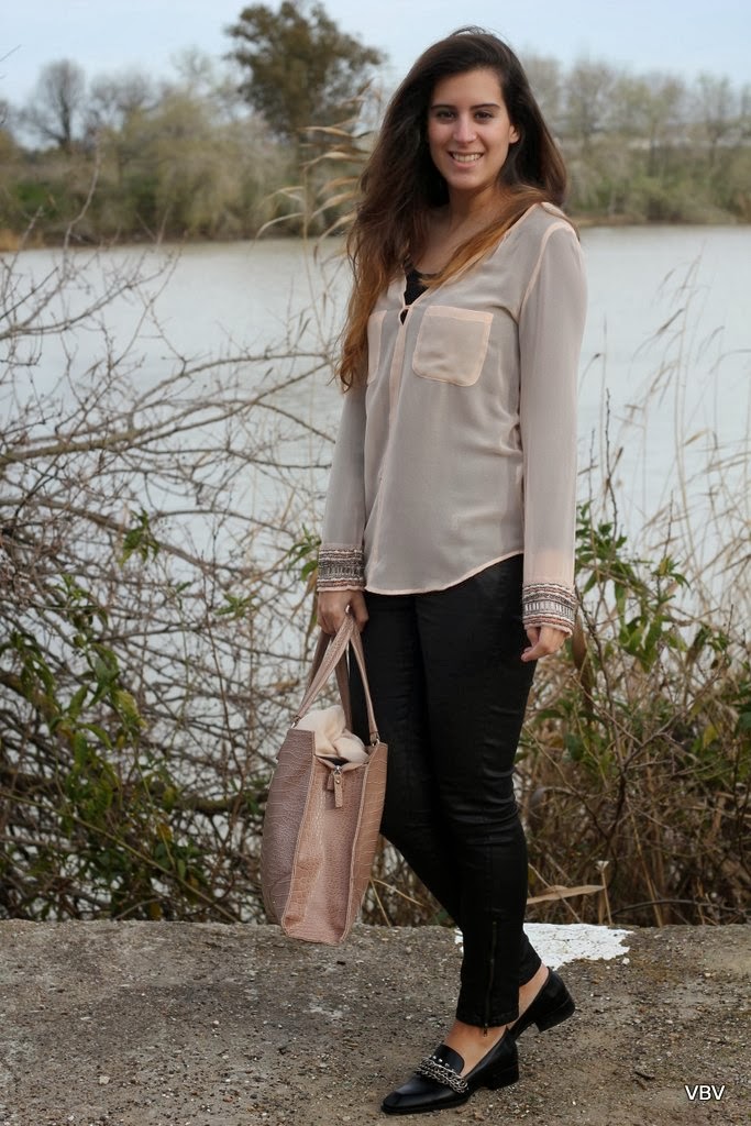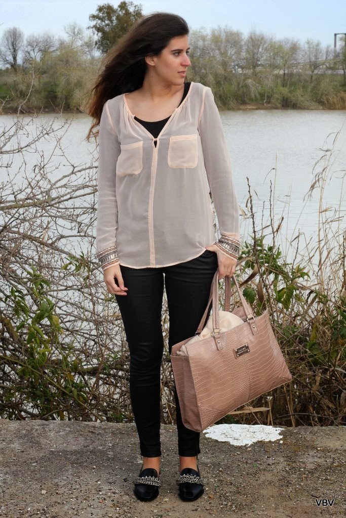 Lo que tenía claro desde que pensé el look es que quería estrenar mis nuevos zapatos si o si, son de Zara y me encantaron desde que los vi la primera vez pero tenía claro que no iba a gastarme 70€ aunque fuesen de piel…pero cuando daba una vuelta por las últimas rebajas el jueves me los encontré rebajados a 39´90€ y no pude resistirme. Me gusta mucho utilizar zapatos planos y aunque tengo muchas manoletinas al final te acabas cansando de su forma y del aspecto tan aniñado que le da a los outfits, así que he encontrado en los mocasines una forma de ir cómoda pero con un toque chic. El resto del look es muy sencillo, una camisa rosa bebe, unos pantalones negros encerados y un maxi- bolso. Espero que os guste chicas.