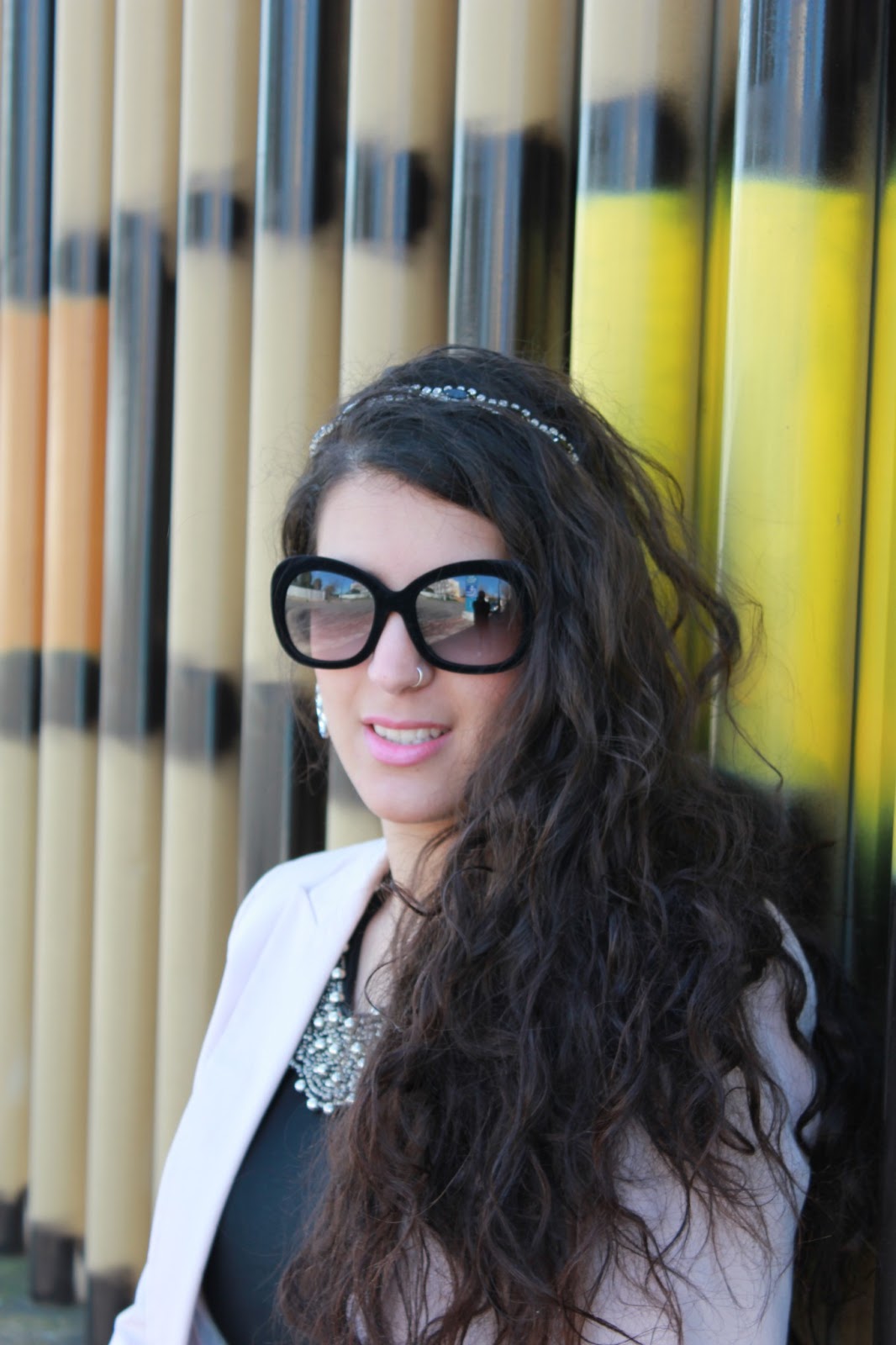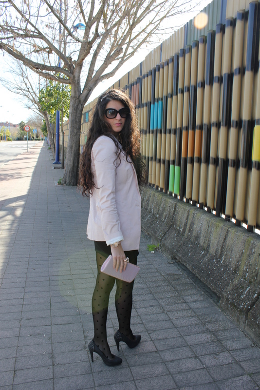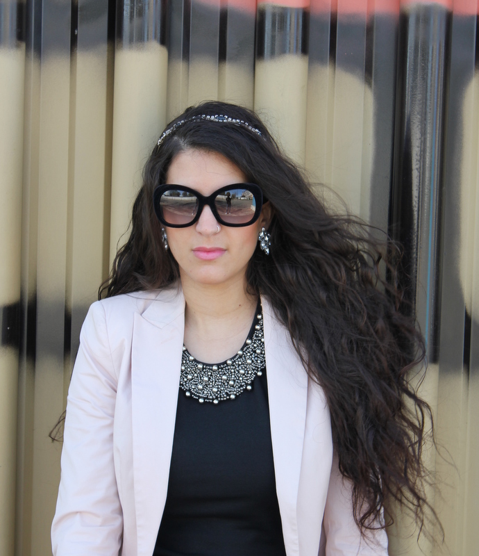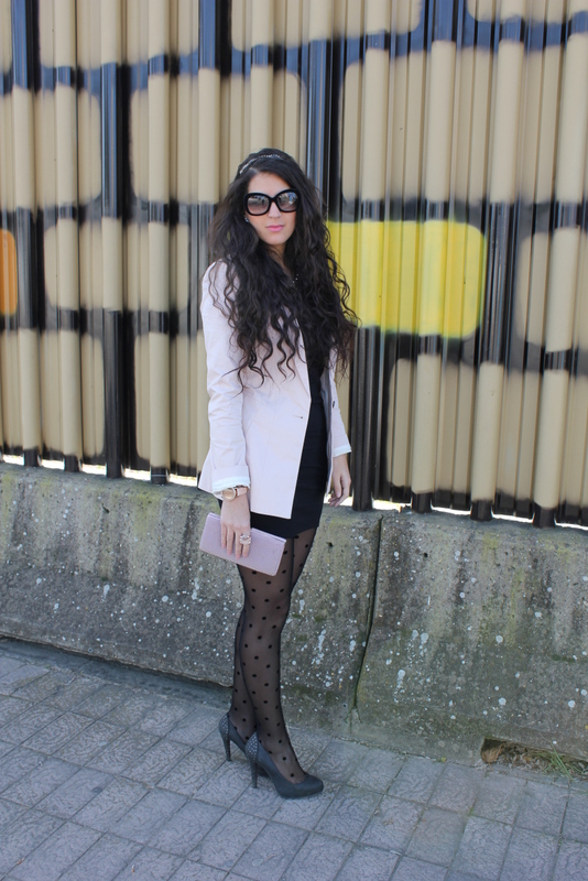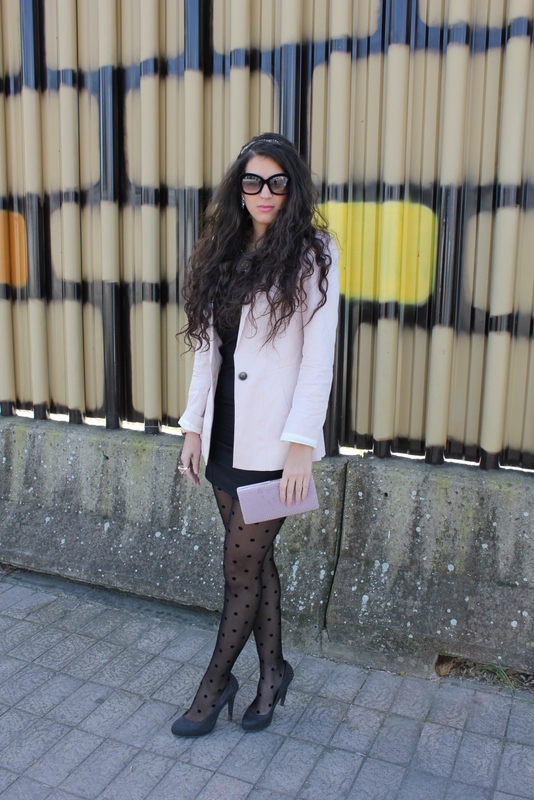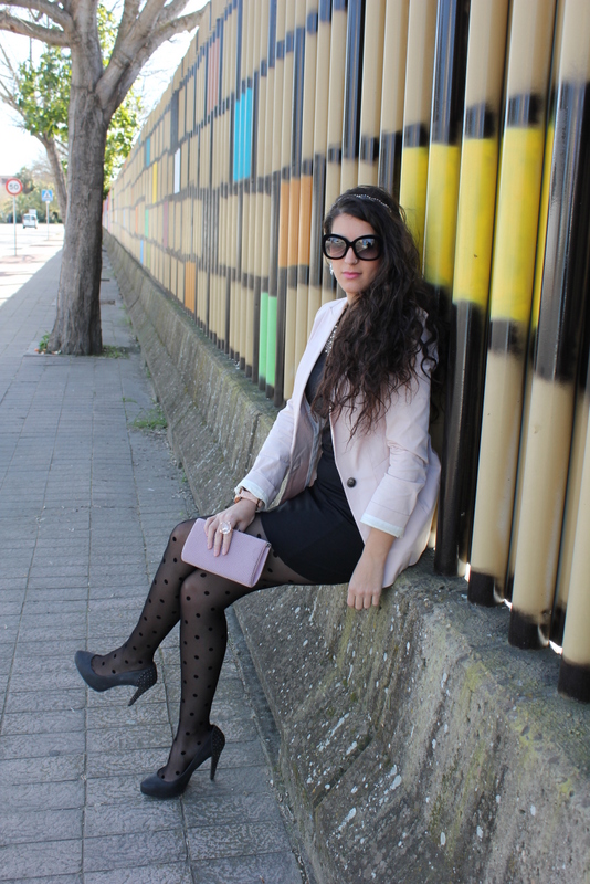 ¡Hola a todos! Como os comente aquí tenéis un nuevo outfits creado en base al vestido que me regalaron mis super amigas 🙂 Es un LBD pero con un cuello tipo bebe lleno de perlitas en plata, perfecto para usarlo de día o si quieres salir arreglada por la noche. En Sevilla las temperaturas han bajado muchísimo y tuve que utilizar una blazer color rosa bebe al igual que el clutch. El detalle se lo dan las medias de lunares de terciopelo y mis nuevas gafas también de terciopelo, me encantan.