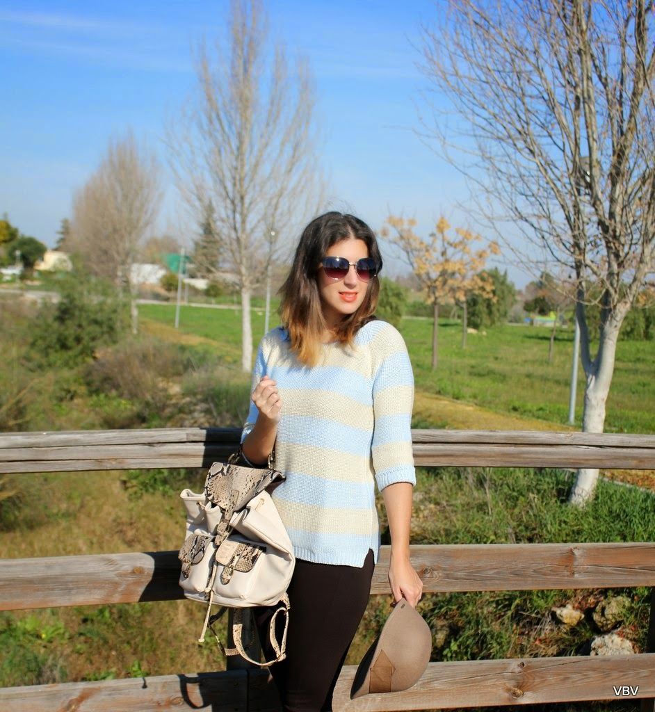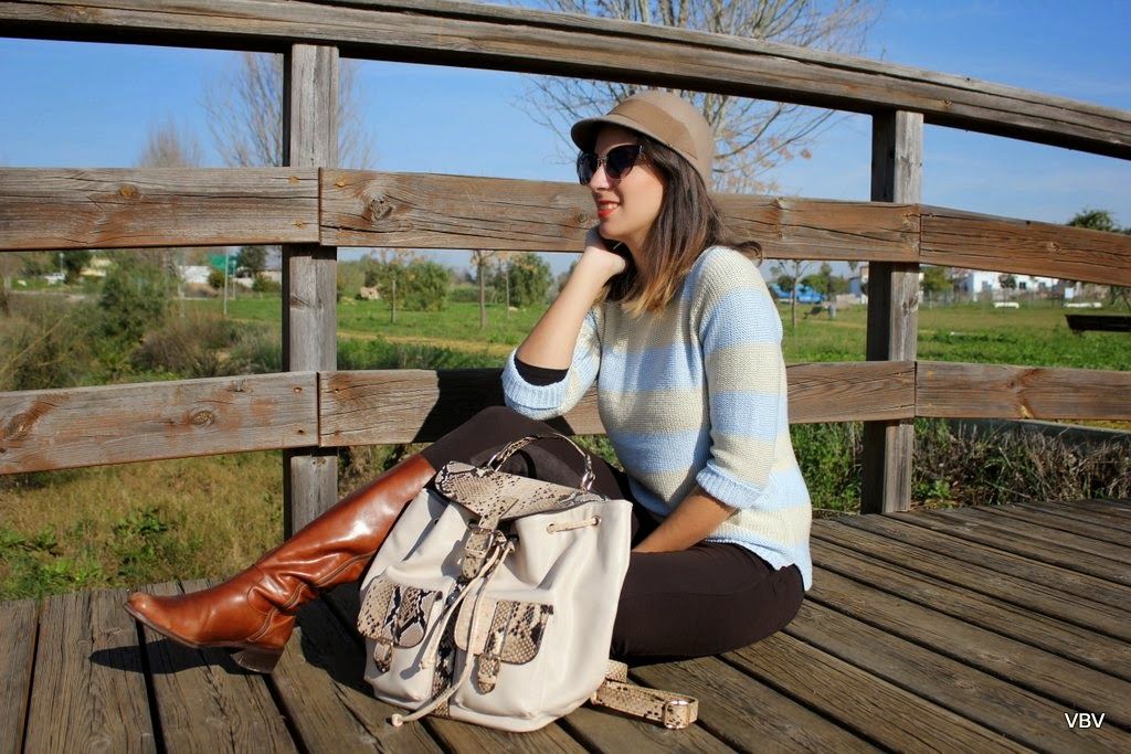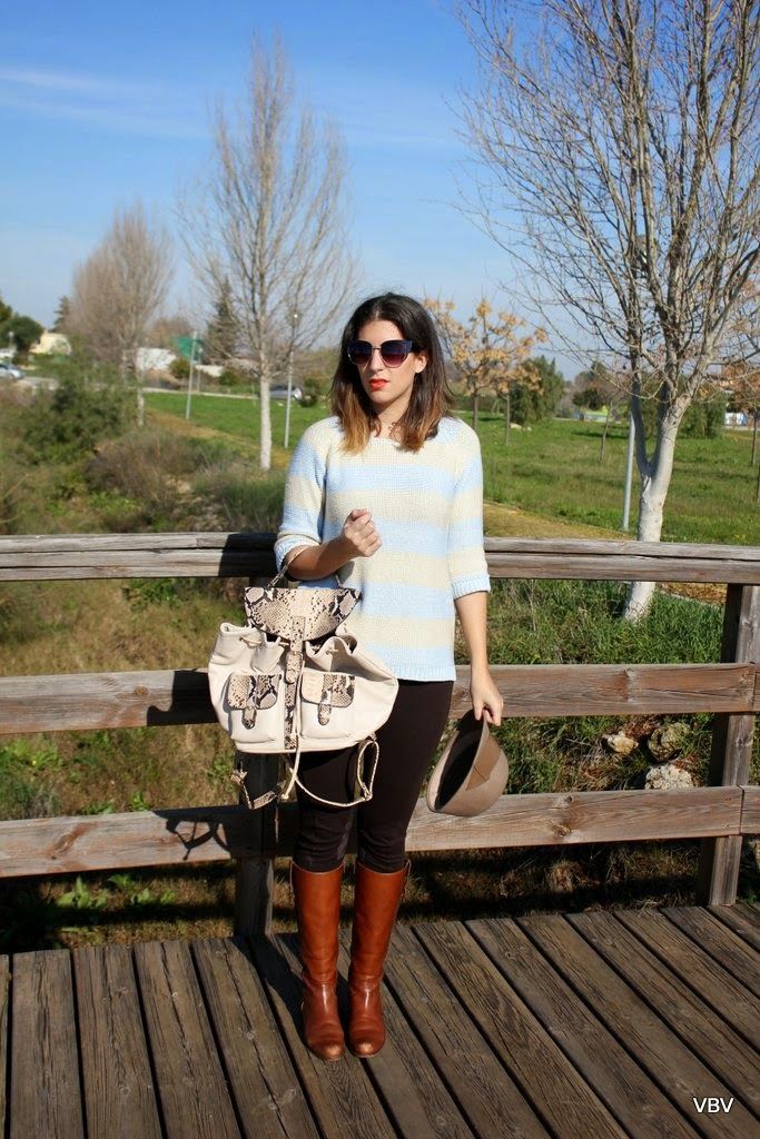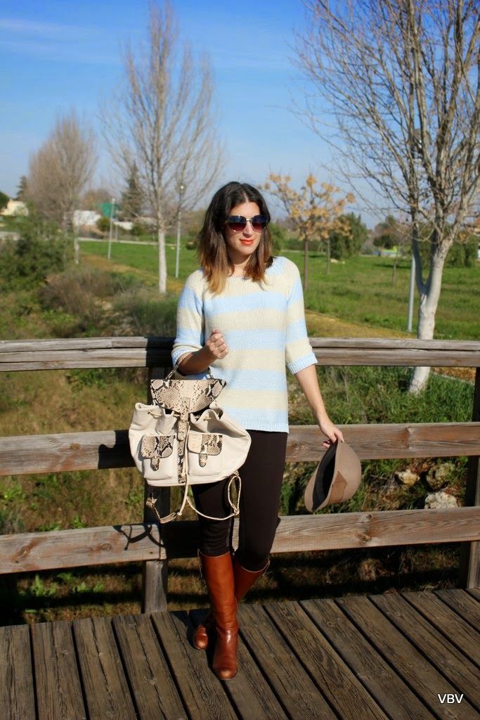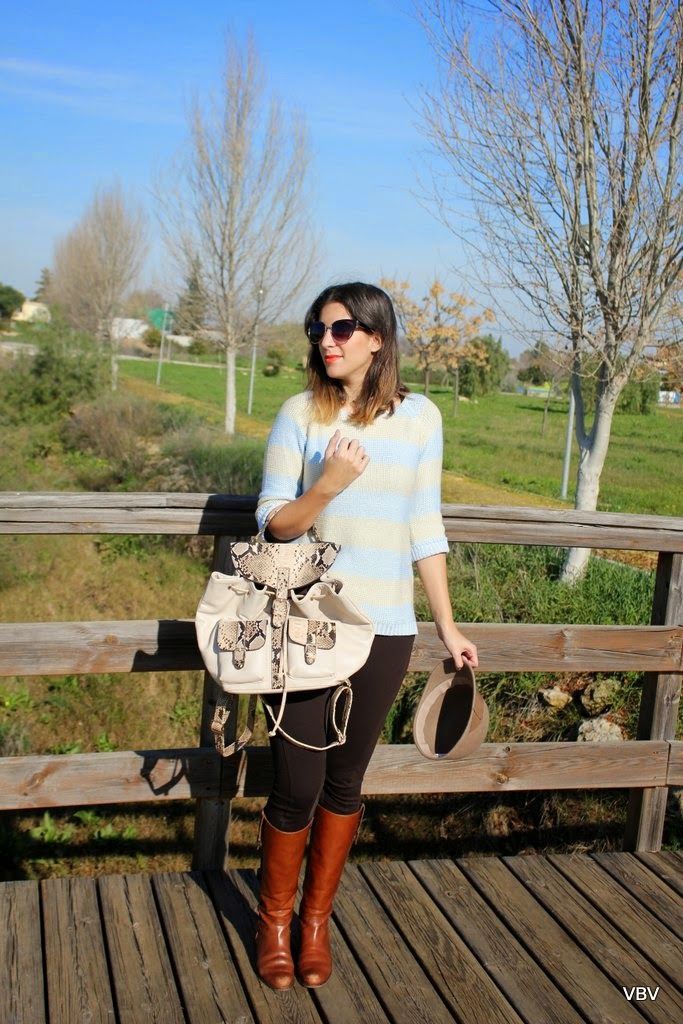 No suelo utilizar jerseys de rayas pero el tándem celeste pastel y beige me encanta, y me parece perfecto para combinarlo con tonos marrones como éstos leggins de inspiración ecuestre y mi mochila de Parfois. Las botas de piel son un básico de armario, yo estoy buscando unas en negro ahora que están de rebajas y os recomiendo que os hagáis con un par si aun no las tenéis ¿Os a gustado el look?