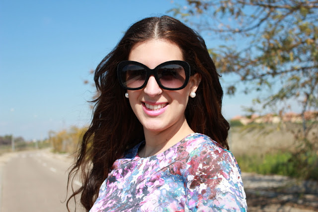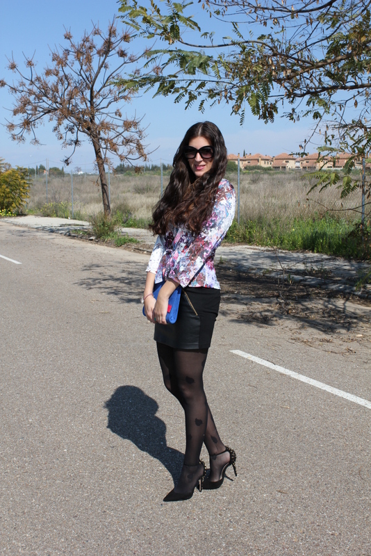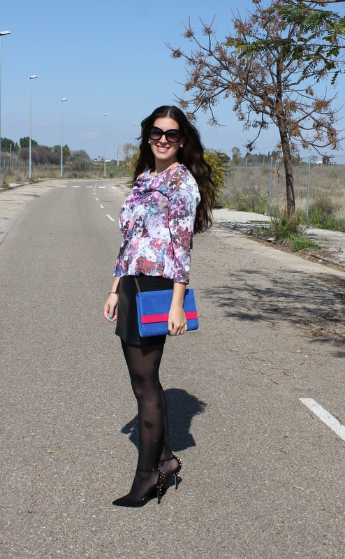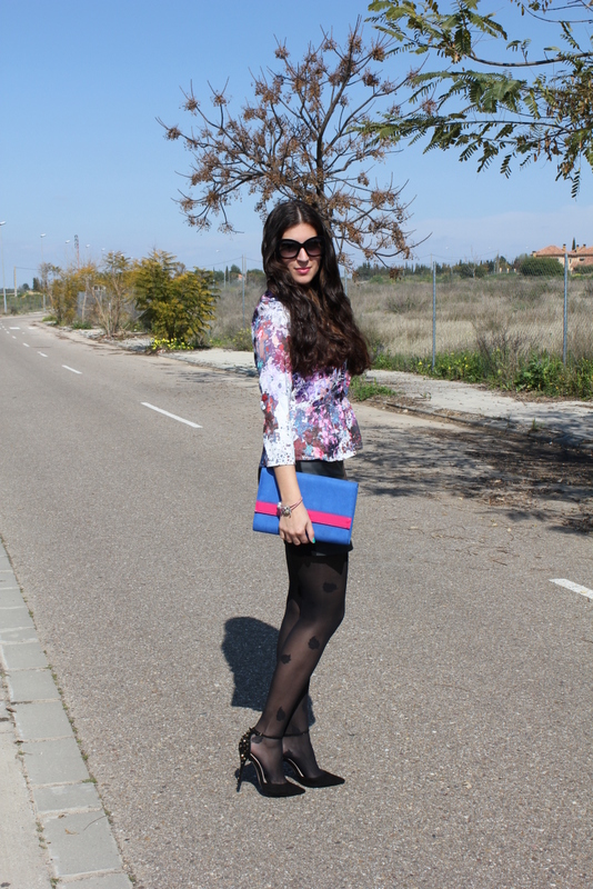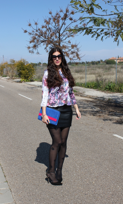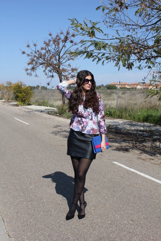¡Hola chicas! La primavera esta cada vez más cerca y aunque media España esta sumergida en una ola de frío, en Sevilla pudimos disfrutar el domingo de un sol más que apetecible para salir a tomar algo a una terraza. Para la ocasión elegí un top peplum con un estampado floral en tonos morados y burgundy, falda de cuero negra y bolso en azul y rosa. El resultado me ha gustado mucho y creo que puede ser unos de los outfits para Semana Santa, divertido pero elegante.