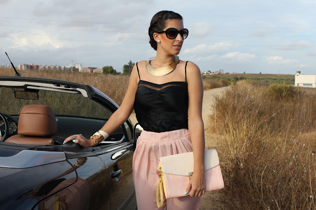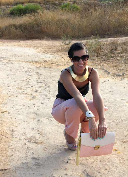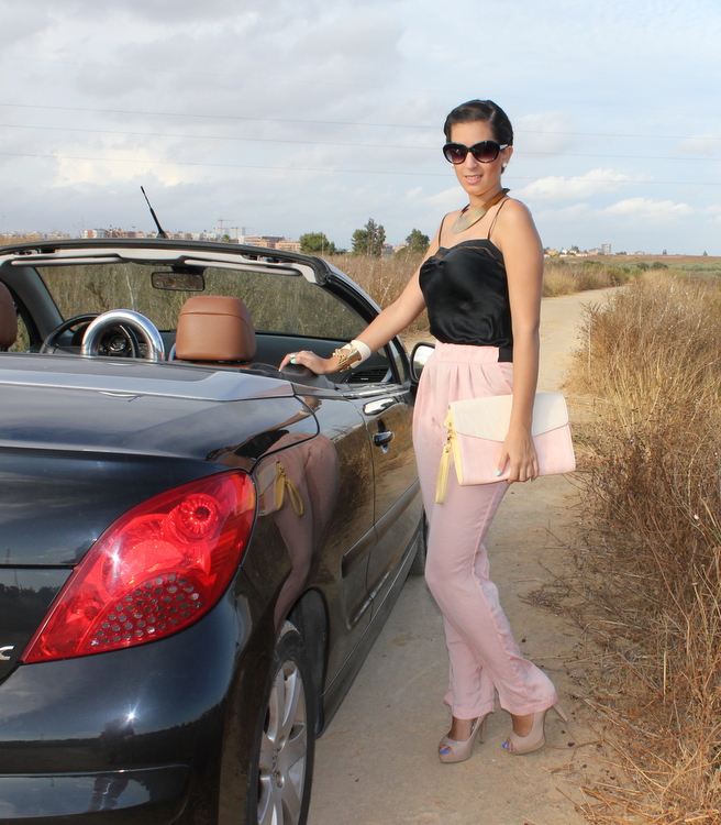 Para la ocasión elegí unos pantalones anchos en rosa bebe combinados con un top básico de noche en satén y mi clutch favorito acompañado de complementos en dorado.