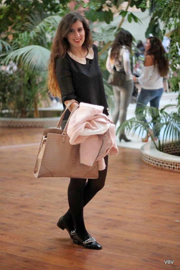 Aunque tenía pensado un outfits más colorido el día no acompañaba mucho y al final cambie opté por uno más abrigado, y menos mal porque al salir nos moríamos de frío. Ya os había enseñado mi falda de rayas ejecutivas en color gris (aquí) y de nuevo aposte por el rosa pastel para combinarla, la camisa negra tiene un cuello de bebe en el mismo color así que es la escusa perfecta. Y para darle el toque de color mi cazadora de Stradivarius y mi maxi- bolso de Mango, perfecto para guardar la cámara. Espero que os guste y no os olvidéis de dejarme vuestras opiniones, un beso enorme.