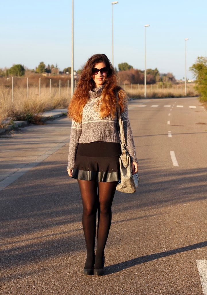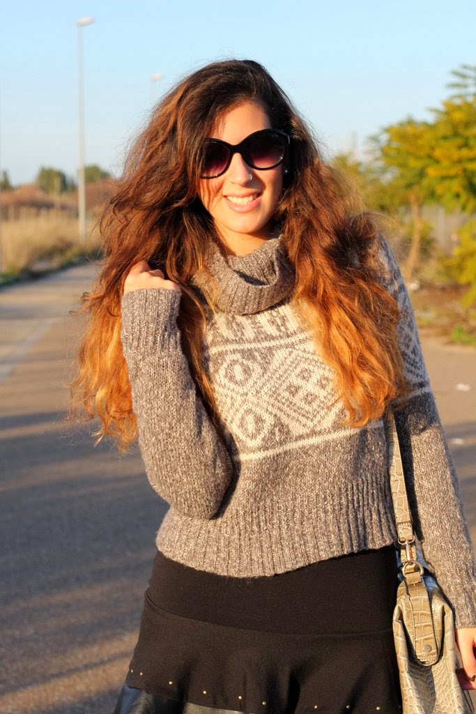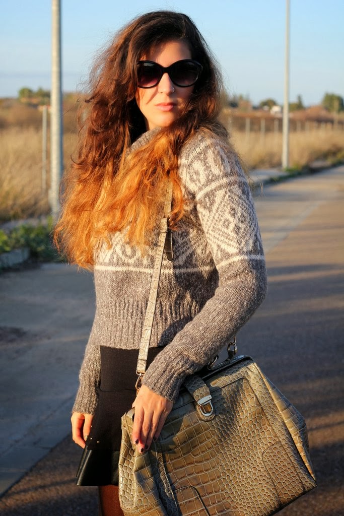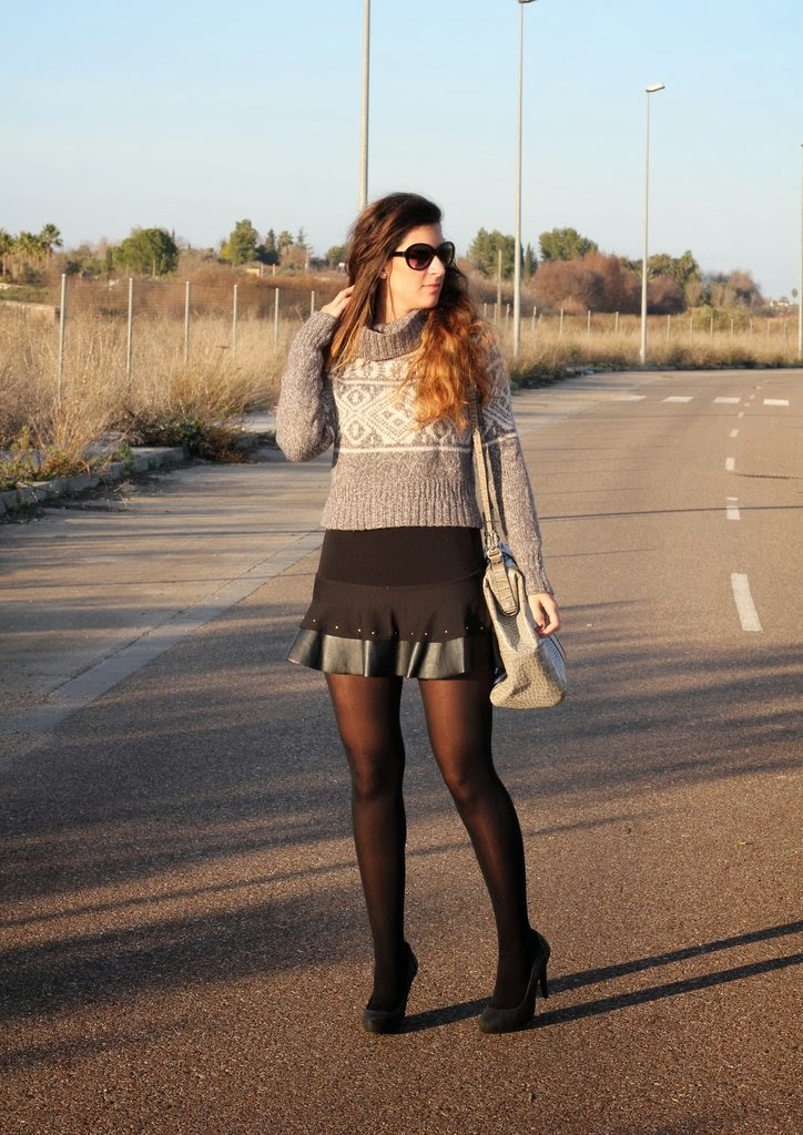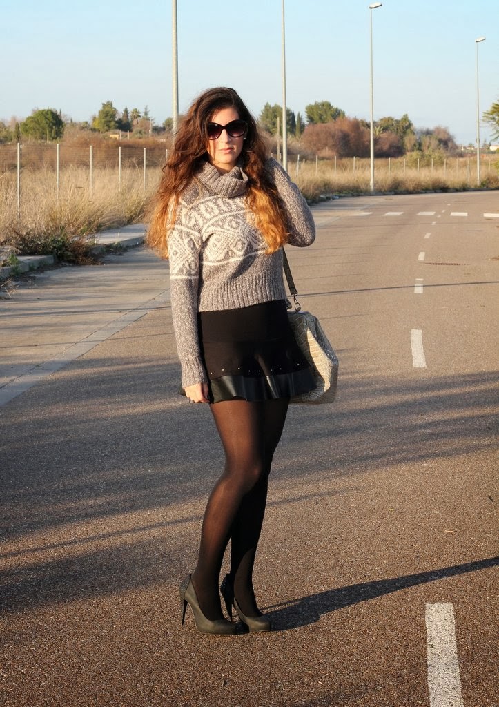 El outfits de hoy lo hice pensando en el jersey gris, creo que es la primera vez que aparece por el blog aunque es del invierno pasado. Me encanta su estampado tan invernal y además abriga un montón pero su problema es que es cortito y no me gusta como se ve con pantalones porque acentúa las caderas y te deja media cintura al aire. Dándole vueltas a cómo utilizarlo se me ocurrió combinarlo con esta falda negra con los filos en cuero y que por suerte tiene la medida exacta para que me cubra la piel y pueda utilizarlo, así que voy a ir probando con otras que tengo y quizás también le vengan bien. Para completar mi look de fin de semana mi inseparable maxi-bolso de Day a Day donde puedo guardar todo lo necesario para el día.