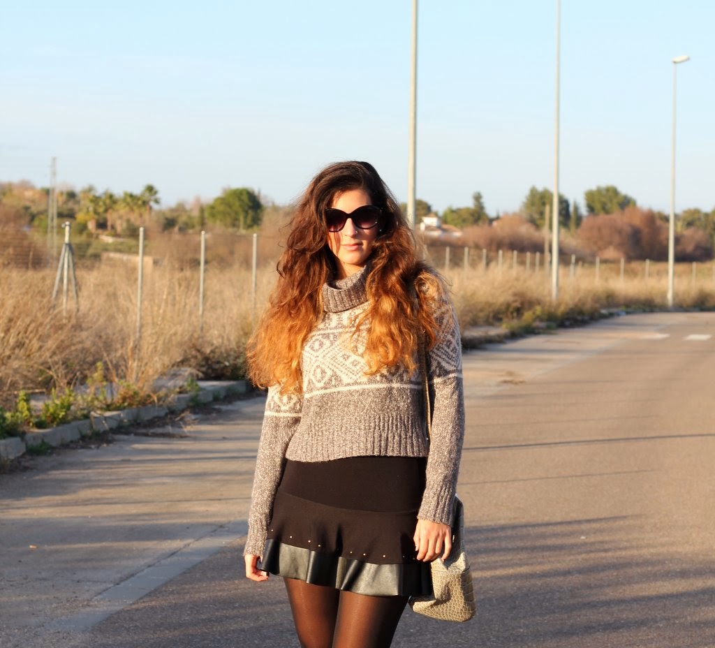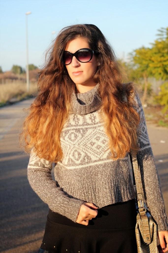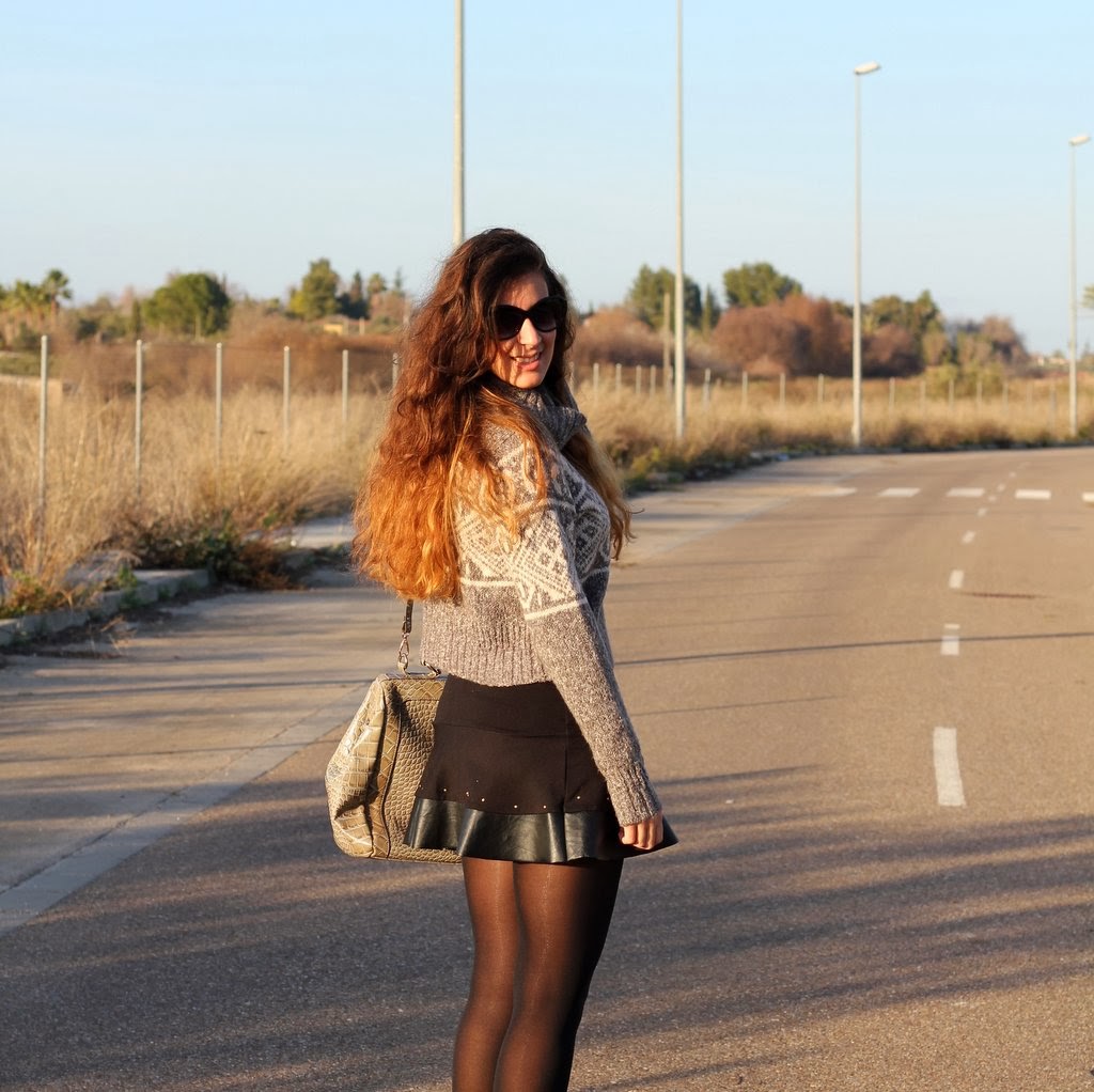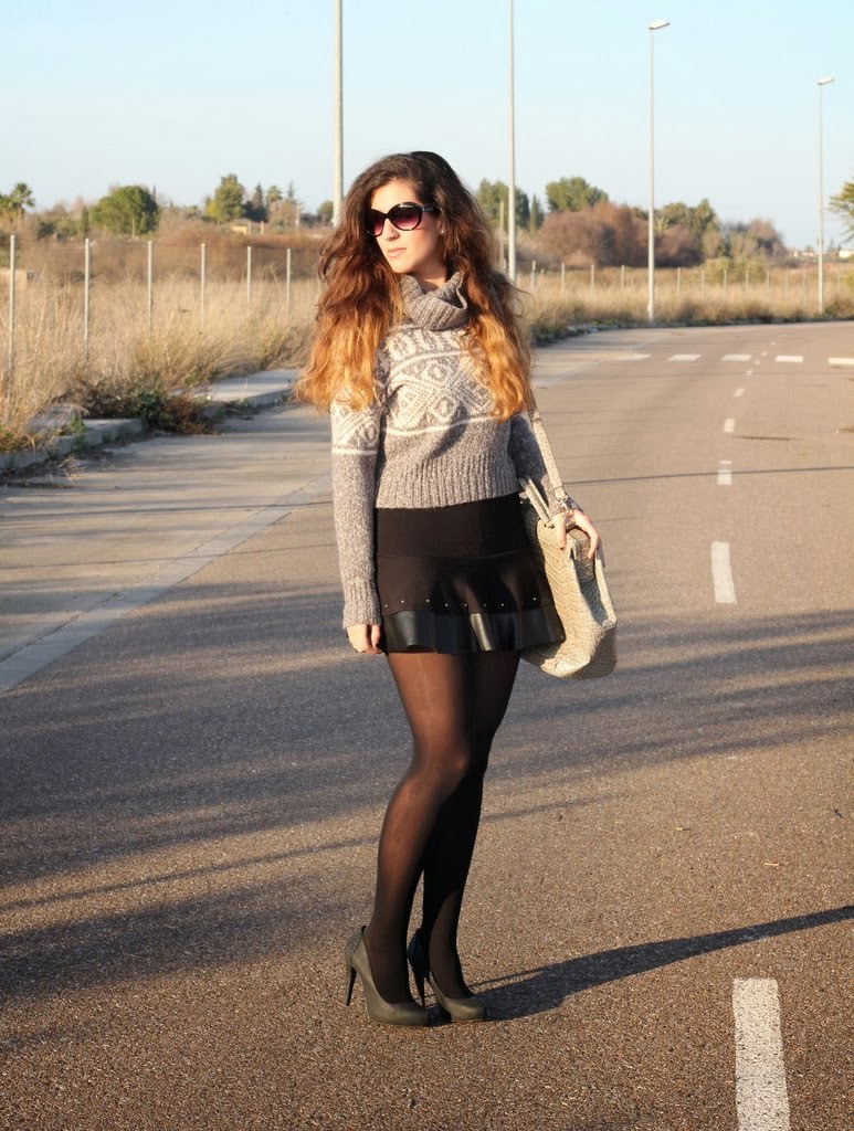 El outfits de hoy lo hice pensando en el jersey gris, creo que es la primera vez que aparece por el blog aunque es del invierno pasado. Me encanta su estampado tan invernal y además abriga un montón pero su problema es que es cortito y no me gusta como se ve con pantalones porque acentúa las caderas y te deja media cintura al aire. Dándole vueltas a cómo utilizarlo se me ocurrió combinarlo con esta falda negra con los filos en cuero y que por suerte tiene la medida exacta para que me cubra la piel y pueda utilizarlo, así que voy a ir probando con otras que tengo y quizás también le vengan bien. Para completar mi look de fin de semana mi inseparable maxi-bolso de Day a Day donde puedo guardar todo lo necesario para el día.
