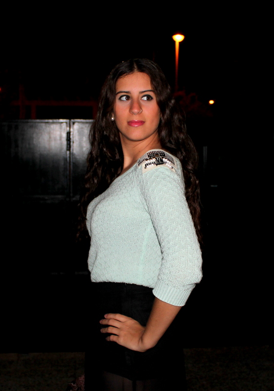 Mint Sweater and Black Skirt