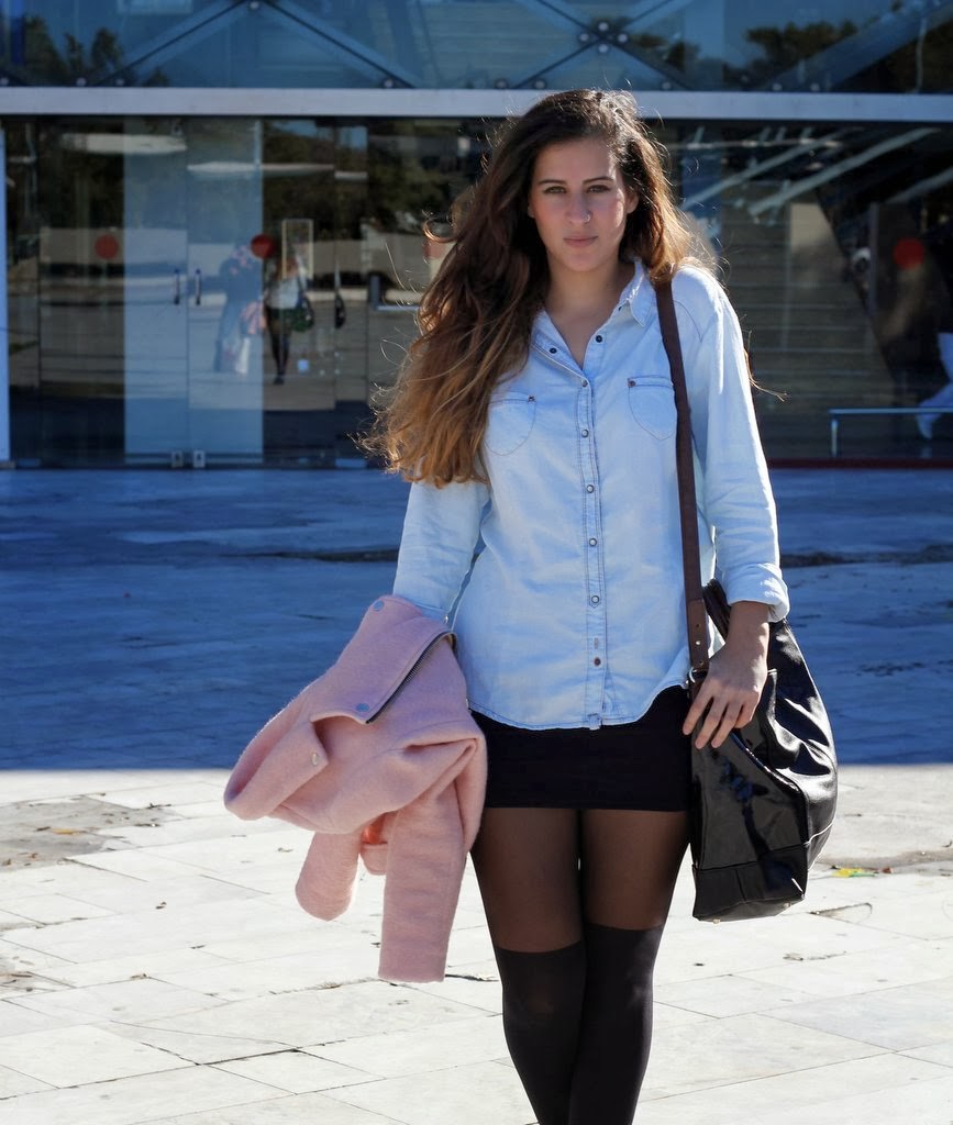 ¡Hola guapas! Si ayer os mostraba el outfits que llevé el domingo para el cumpleaños de mi novio hoy os enseño el look que utilicé el jueves para almorzar con él en el Fosters Hollywood, uno de nuestros sitios favoritos. La verdad es que suelo ser muy clásica en cuanto a medias se refiere, apuesto por las lisas en color negro o con plumeti pero llevaba mucho tiempo detrás de unas que simulasen llevar un calcetín alto y creo que son todo un acierto porque dan mucho juego a los outfits y rompen con mi estilo personal. El resto del look se basa en colores negros y para darle un toque de color una camisa vaquera que siempre sienta bien y mi cazadora rosa que no puedo separarme de ella. Espero que os guste 🙂