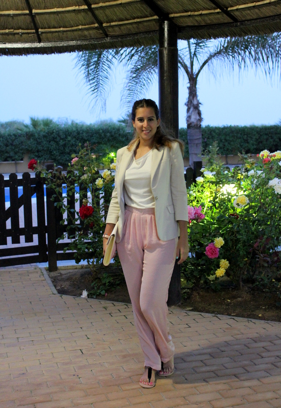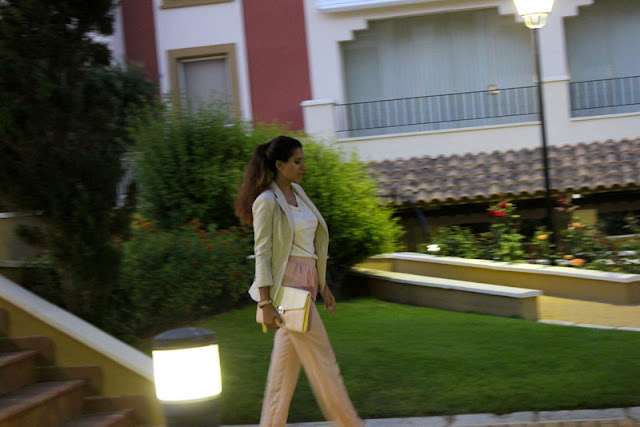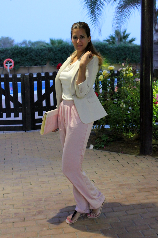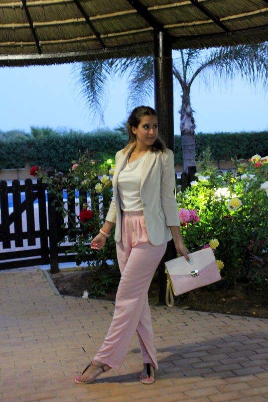 El pantalón estilo palazzo es uno de mis favoritos pero no le suelo dar mucho uso en Sevilla por sus altas temperaturas, solo puedo resignarme y esperar a llegar a la costa para poder ponérmelo. De hecho, ya os lo enseñé en uno de mis primeros post, podéis verlo pinchando aquí. En esta ocasión decidí combinarlo con una camiseta y una blazers en tonos beige, el mismo clutch y unas sandalias para ir cómoda.