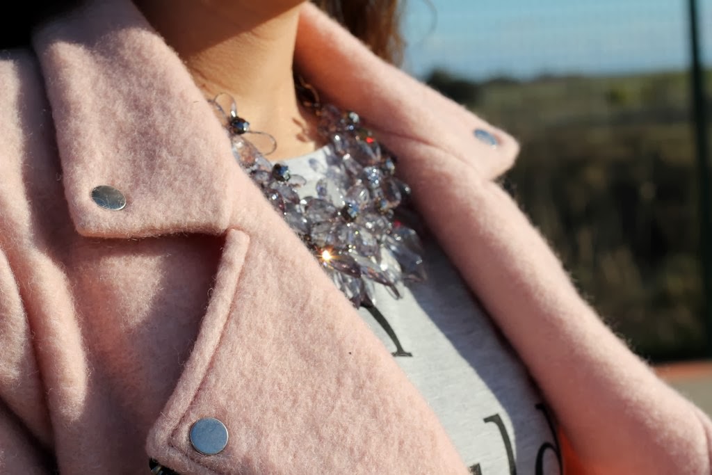 ¡Buenos días! Quería esta chaqueta rosa de Stradivarius desde que apareció en la web pero como se parece mucho al abrigo rosa que me regalaron mis padres de Zara decidí no hacerme con ella…pero claro llegan las rebajas y cuando la vi a 30€ no pude resistirme. La sudadera también me la compré el mismo día y es súper cómoda, además nunca había tenido una de neopreno y me apetecía incluir nuevos tejidos en mi armario. El collar de cristal que le da un punto muy chic al look y desvía la atención del rosa. Espero que os guste.