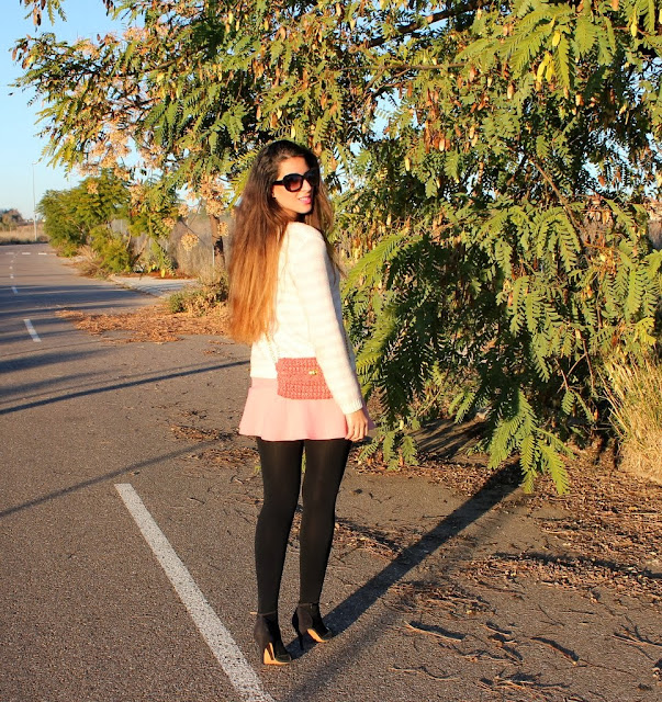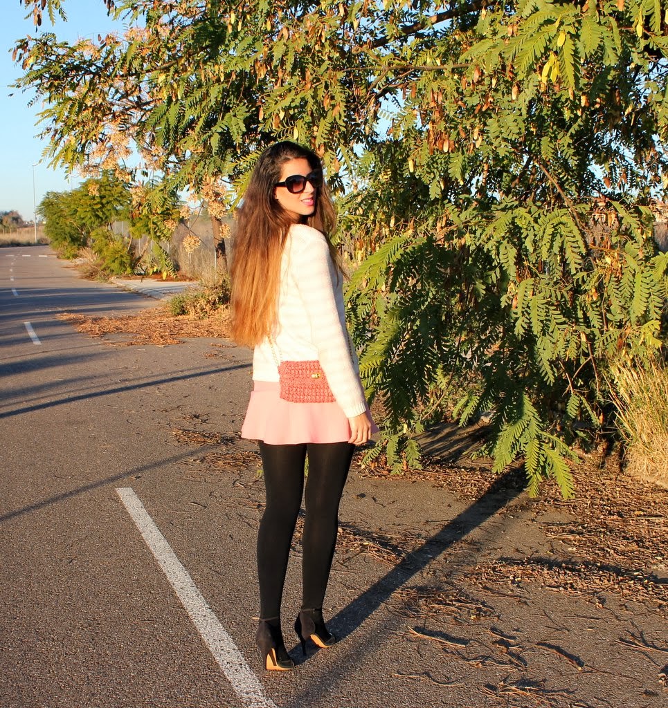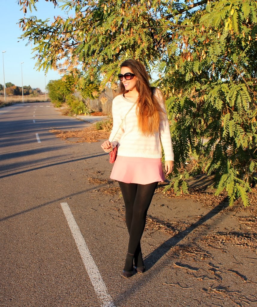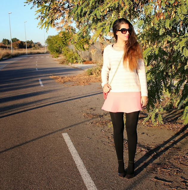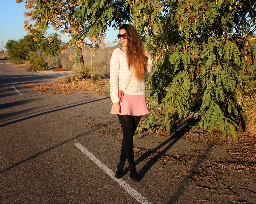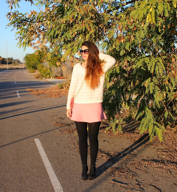 ¡Holaaa! Por fin estamos de vacaciones de Navidad, es una de las épocas más bonitas del año y si hay algo de lo que nunca me canso es de pasear por Sevilla de noche. Así que aquí tenéis el outfits que me puse ayer para cenar por el centro con mi chico y después caminar un buen rato, llevaba también mi abrigo rosa que ya habéis visto aquí y aquí pero se me olvidó fotografiarme con él. No había utilizado mi falda rosa desde que entro el frío pero si utilizas unas medias gorditas no hay ningún problema y me apetecía combinarla con mi jersey de rayas en blanco y rosa. Un look con mucho color para dejar de lado el negro invernal y animarnos el día.