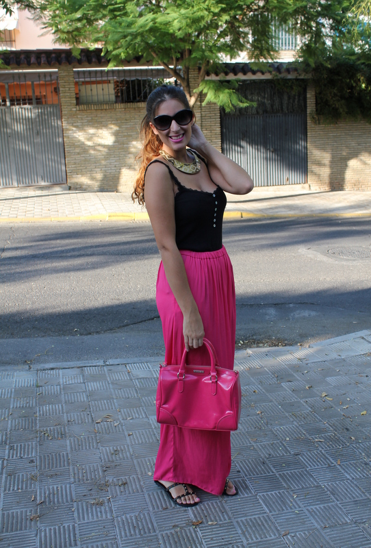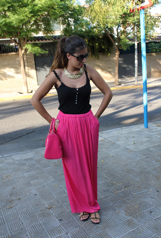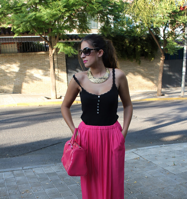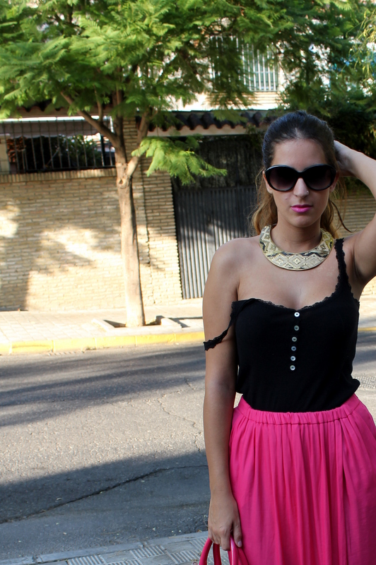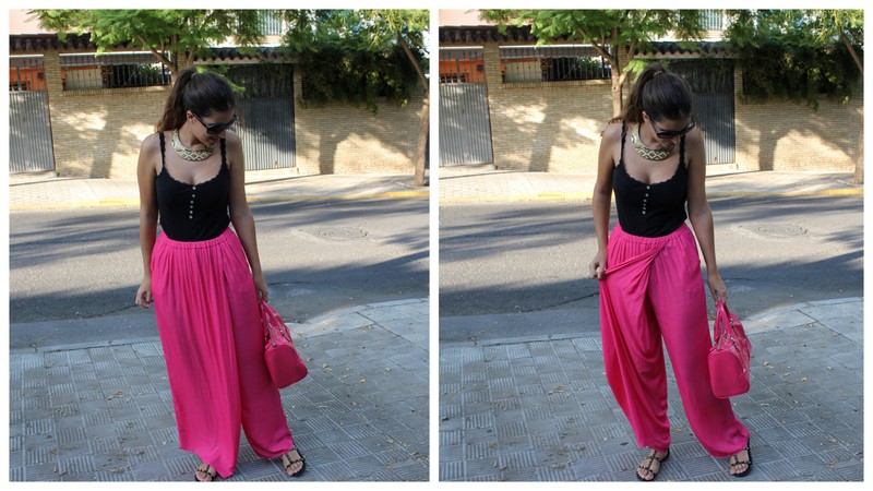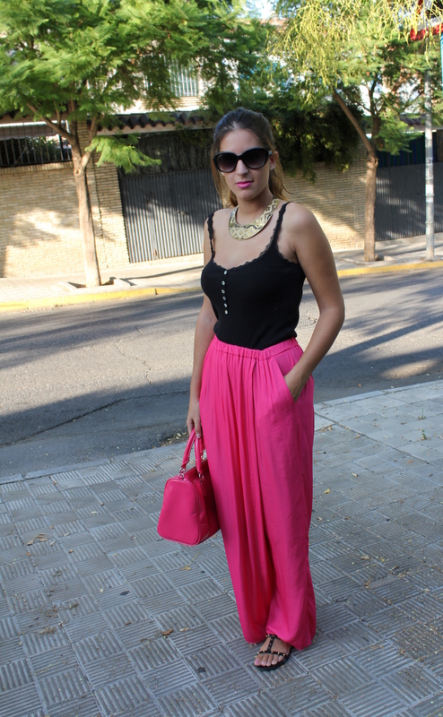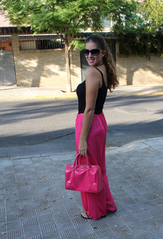 Las fotos son del 8 de septiembre el día de mi santo, por la tarde fuimos a hacer unas compras y me apetecía algo cómodo además las temperaturas ya son más suaves y puedo permitirme el utilizar pantalón largo sin morir en el intento. Los pantalones palazzo ya los visteis aquí, aunque en esa ocasión los combiné más formal para salir por la noche, así que esta vez me decidí por los tonos negros para acompañar al rosa y mi bolso de Mango que casualmente tiene el mismo tono fucsia.
