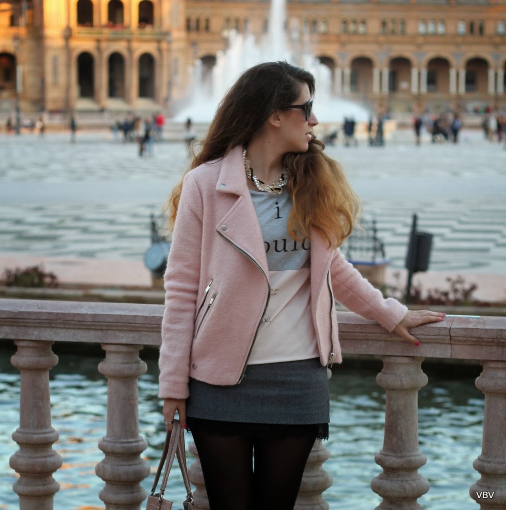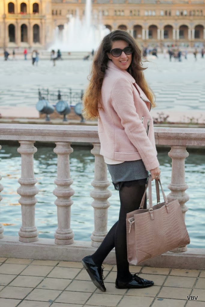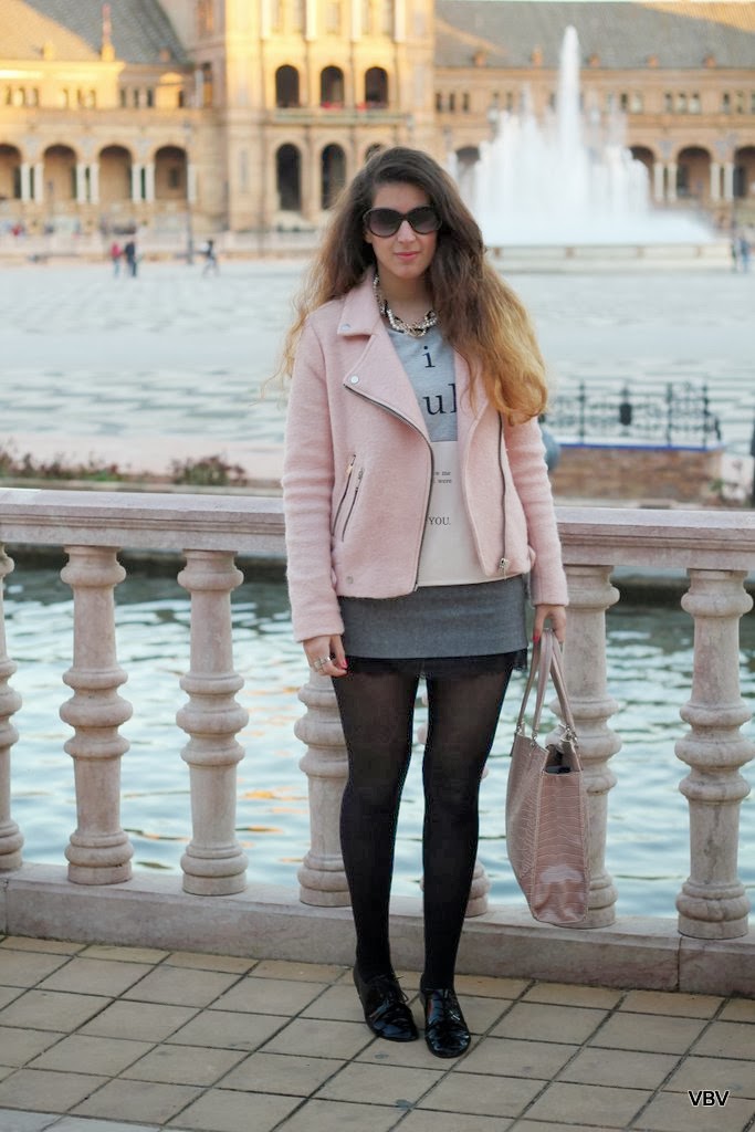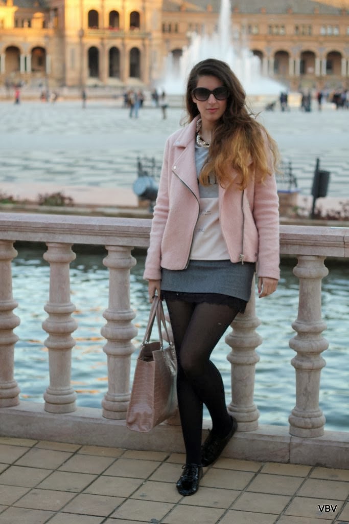 ¡Hola chicas! El sábado salimos mi chico y yo a dar un paseo por las calles de Sevilla así que aposté un look desenfadado que me permitiese ir cómoda pero a la vez chic. De nuevo escogí mi sudadera en tonos pastel de Stradivarius y la chaqueta del mismo color como ya visteis en un post anterior (si queréis recordarlo solo tenéis que cliquear aquí) y como complemento mi falda gris de Zara, unos zapatos oxford de charol en negro y un maxi bolso para guardar la cámara. Espero que os guste y no os olvidéis de comentar.