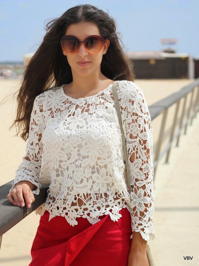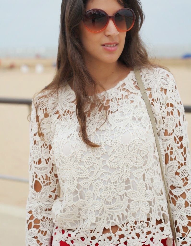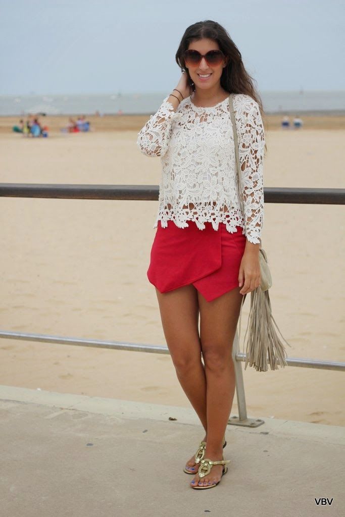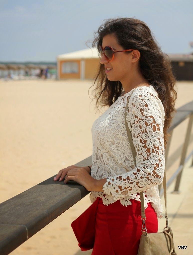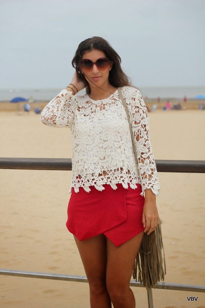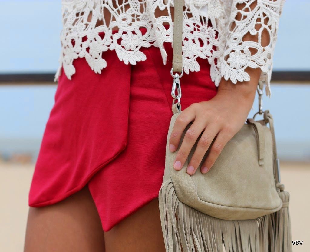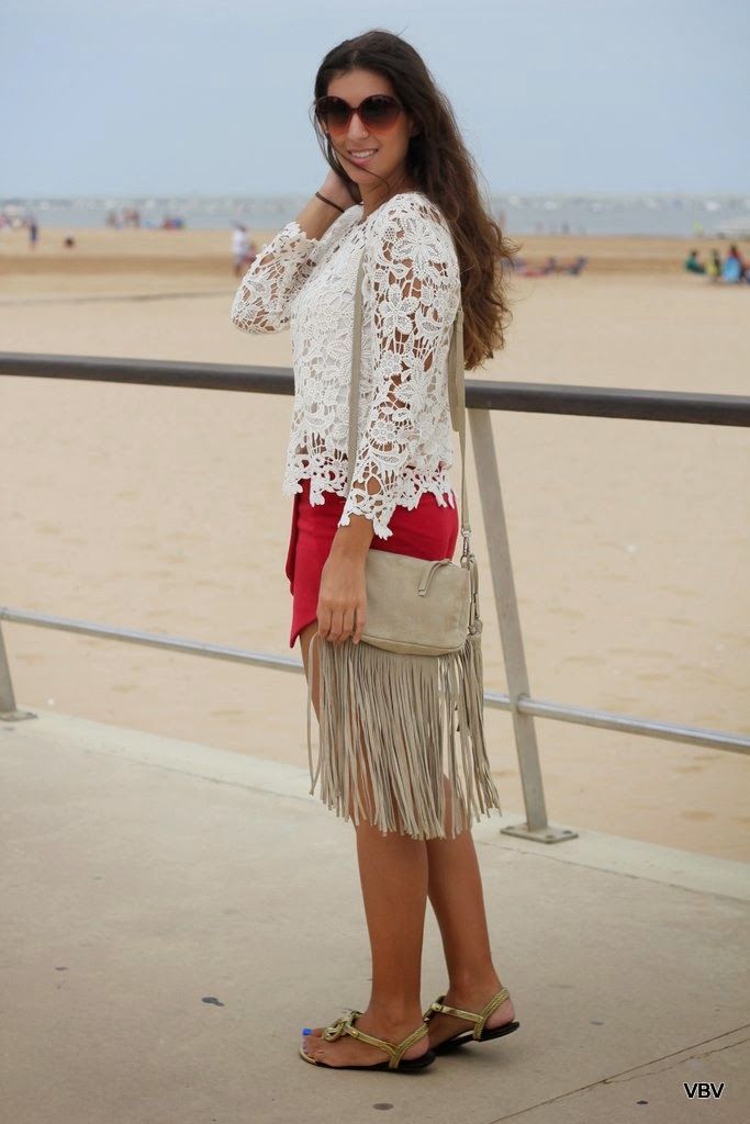¡Hola guap@s! Llevamos unos días en la playa con el tiempo nublado y viento así que no queda más remedio que sacar blusas de manga larga y chaquetas por la noche. La blusa es una de las compras más versátiles de estas rebajas, siempre le da un toque chic a los outfits con el calado de sus mangas y la falda pues es una skort roja que conseguí por menos de 5€ en el factory, la tela no tiene gran calidad pero por ese precio no se le puede pedir más. Y por fin aparece por el blog mi nuevo bolso de flecos, era una tendencia que no me llamaba mucho la atención por sus aires cowboy pero tengo que reconocer que los flecos dan mucho juego en bolsos y chaquetas, y cuando lo vi en Parfois no puede resistirme.