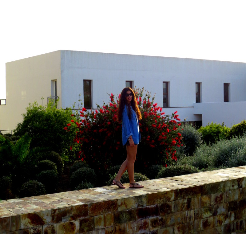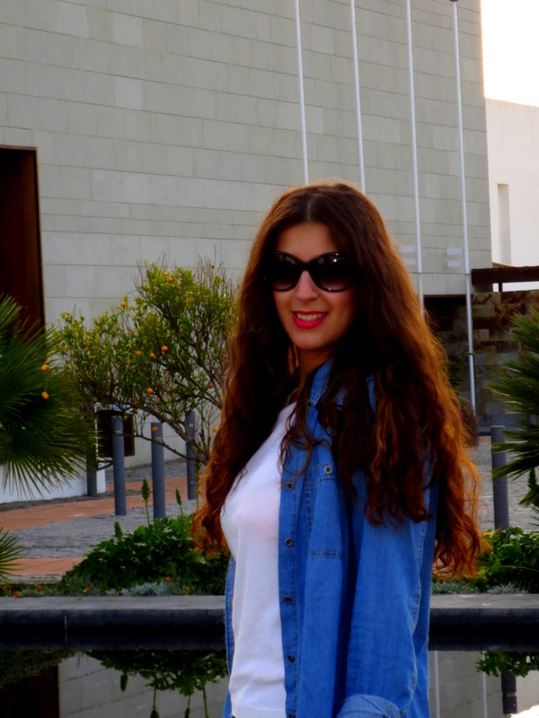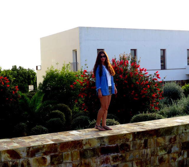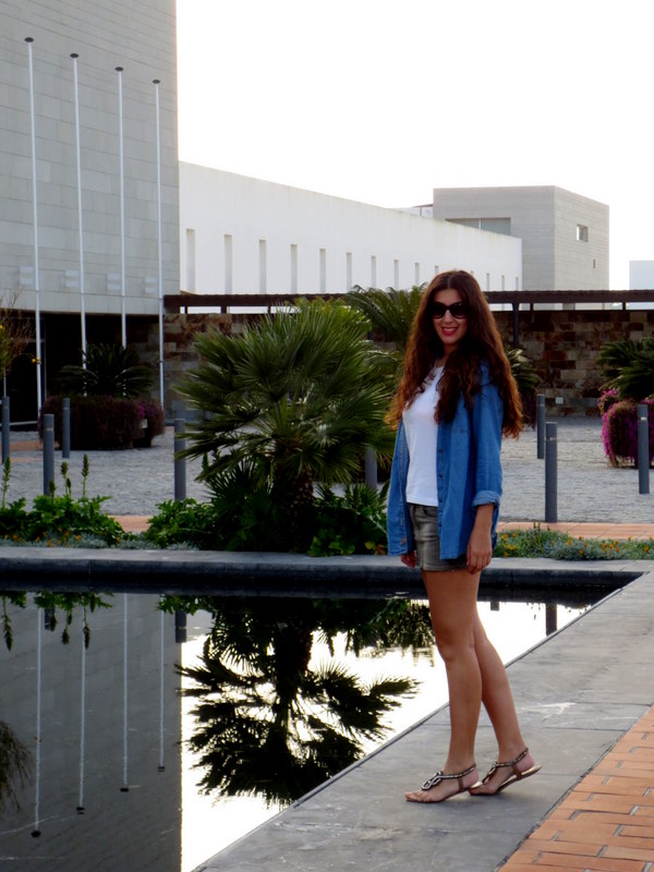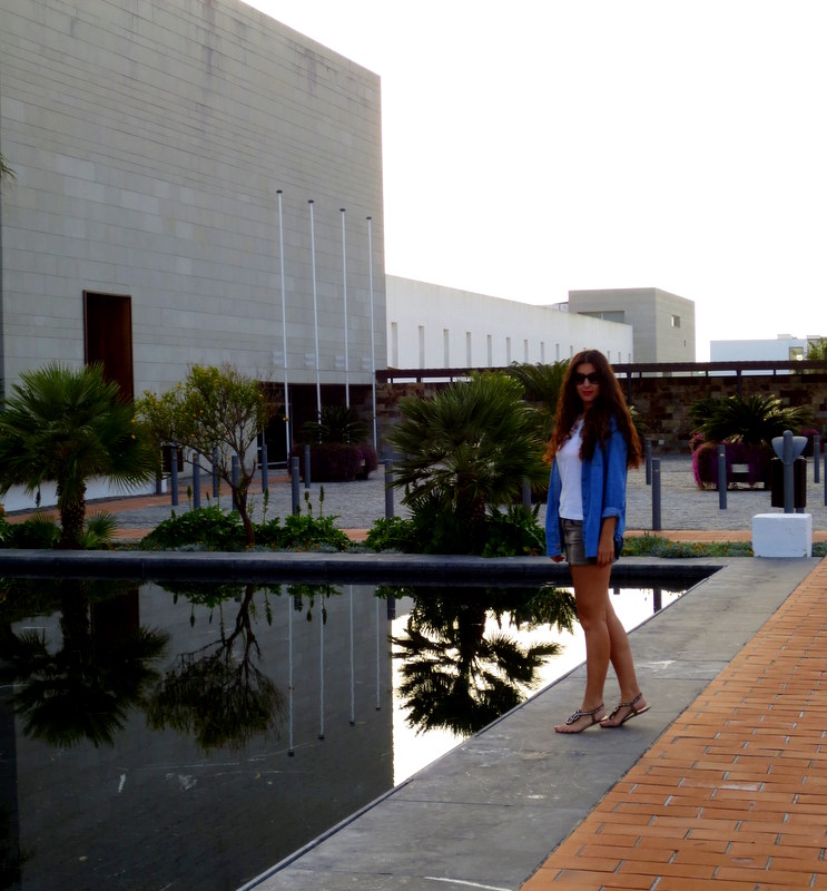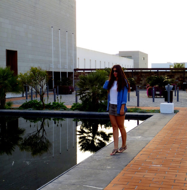 Las fotos las tomamos al atardecer en un estanque que había dentro del Hotel Fuerte Conil- Costa Luz. Combiné el azul de la camisa vaquera con una falda en tonos grises, una camiseta blanca y sandalias. Cuando viajo me decanto siempre por la comodidad durante el día, ni siquiera llevaba bolso 🙂