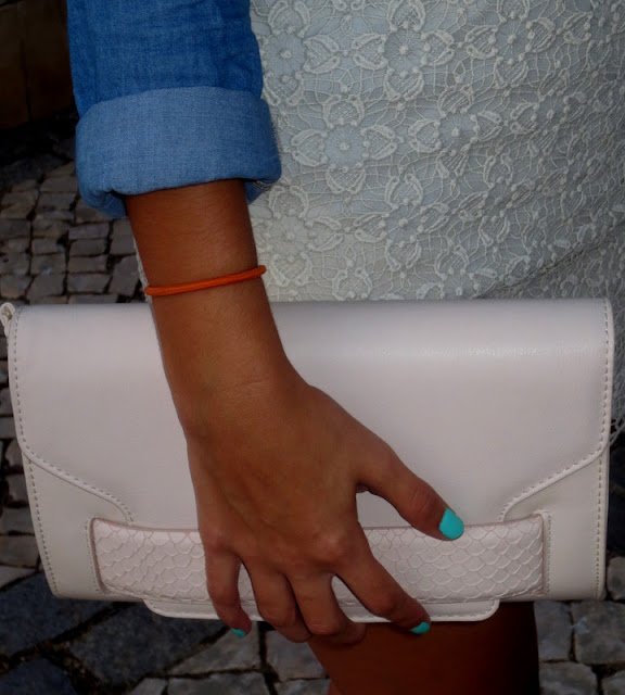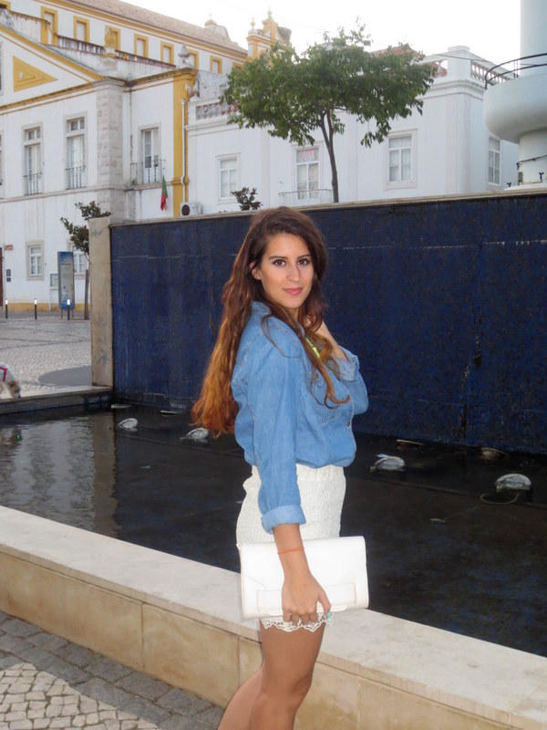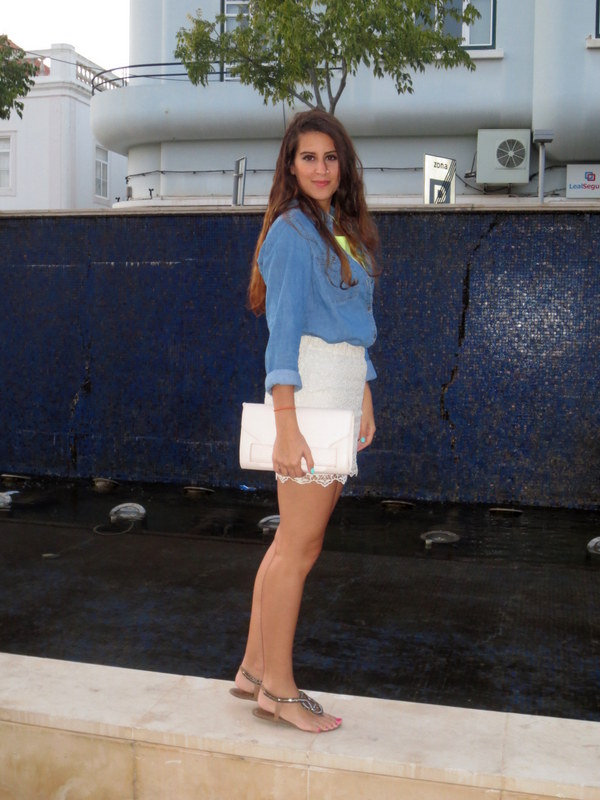 Las fotos están hechas en el centro de Portimao (Portugal), cuando fui con mi chico a pasar un fin de semana. No era un outfits que tuviera pensado pero no llevaba ninguna chaqueta y por la noche refrescaba bastante, sin duda tener una camisa vaquera puede sacarte de mil apuros no sé cómo he tardado tanto en hacerme con una. Por lo demás, mi falda de encaje de H&M con una camiseta básica en amarillo flúor y un bolso también de H&M.