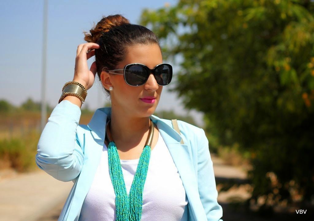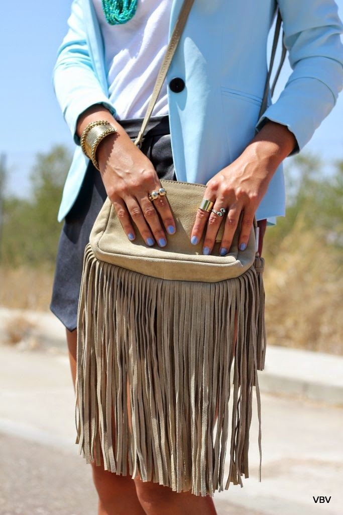 ¡Buenos días! En el outfits de hoy casi todas las prendas que veis son de rebajas. La blazer no pensaba comprármela porque es de Bershka y yo siempre utilizo las de Zara que se adaptan muy bien a mi figura, pero tiene un color súper bonito y con las rebaja que tenía tuve que traérmela, si queréis recordar mis compras rebajiles cliquear aquí y aquí. La falda skort de cuero estiliza las piernas y es un básico para los días en los que no hace mucho calor y el bolso de flecos beige ya lo habéis visto en un par de ocasiones por aquí. Las sandalias de Mango tengo que reconocer que me han decepcionado, cuando andas con ellas son bastante incómodas y no sujetan demasiado el pie, así que son las típicas para darte un paseo muy muy corto, una pena porque quedan genial.