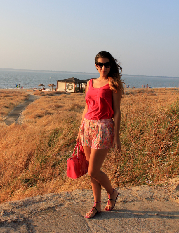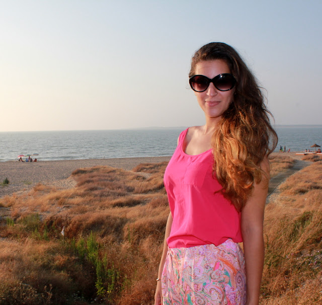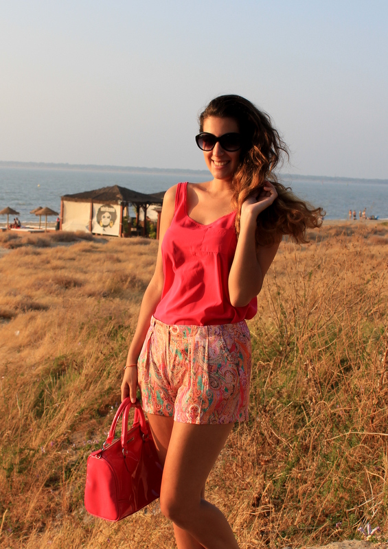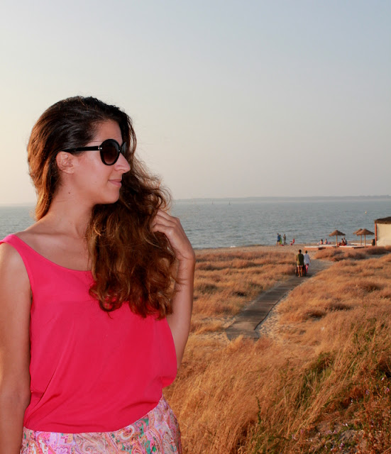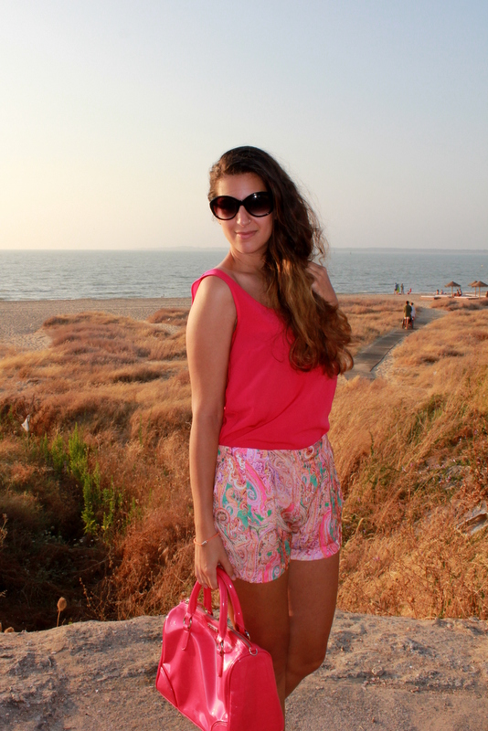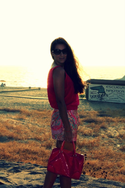 El outfits aunque en esta ocasión es para un día desenfadado se puede utilizar para salir también por la noche, solo hace falta cambiar las sandalias por unos tacones y añadir un clutch. De hecho, lo utilicé el viernes pasado para salir de disco con dos amigas que pasaron la noche en la playa. Los pantalones tienen un estampado digamos «caótico» y prefiero combinarlo con tonos lisos para no recargar más el look y que mejor opción que el rosa fucsia cuando ya tenemos algo de moreno en la piel.