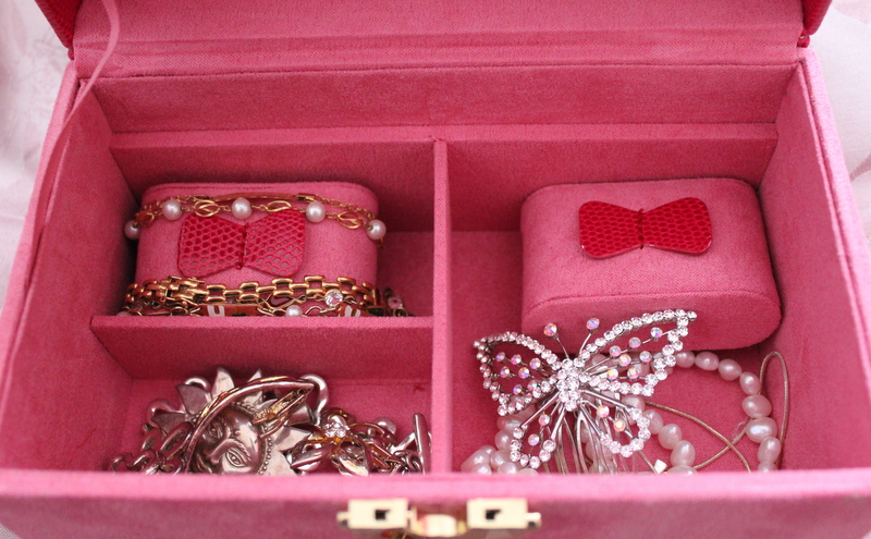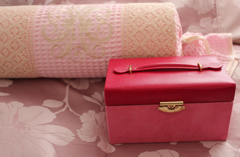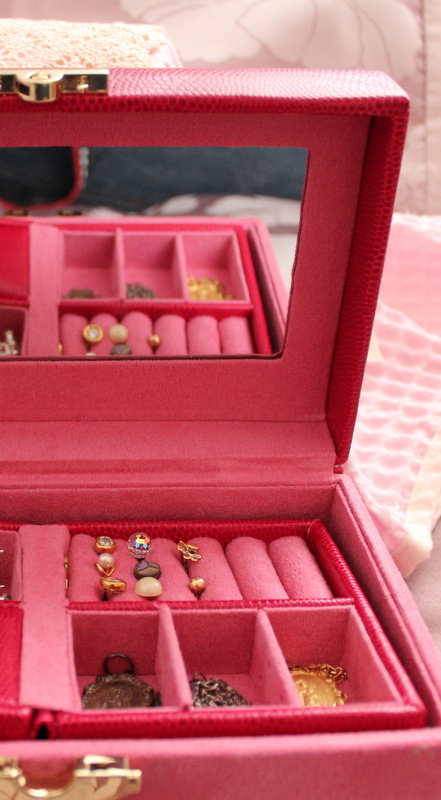 El joyero rosa es un detalle de mi suegra. La verdad es que no suelo darle mucho uso porque mis joyas las guarda mi madre pero lo he utilizado para guardar algunos pendientes sueltos de cuando era chica (siempre perdía uno) y algunas pulseras y cadenitas que tenía guardadas.