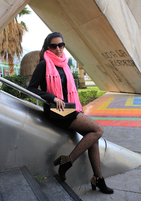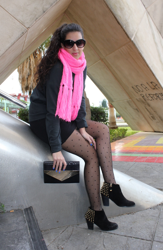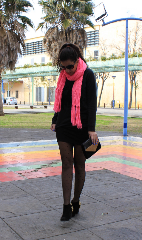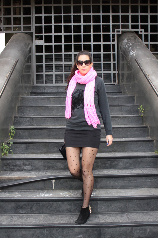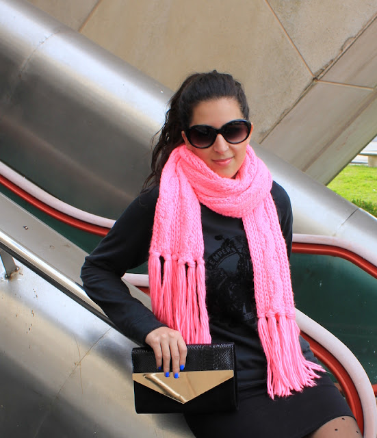El outfits que os enseño hoy es un total black urbano con una nota de color rosa fosforito en la bufanda. La sudadera es una de las prendas que me he comprado en rebajas y uso le doy, la puedo utilizar para un outfits sencillo o para salir por la noche con unos tacones y una falda de cuero ajustada. Cómo me parecía que iba demasiado oscura le he añadido una bufanda en un rosa muy llamativo para alegrarlo.