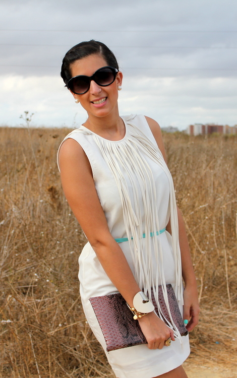 Hoy os enseño un vestido de flecos en blanco roto de Zara. Ademas, al ser un color neutro lo puedes combinar con las tendencias que te apetezca. Yo he decidido utilizar tonos marrones tanto en el bolso con estampado de piel de serpiente como en los peeptoes en tono nude y de charol, para darle todo el protagonismo al vestido y no recargarlo. El detalle de color reside en el cinturón verde agua y las uñas con la misma gama.