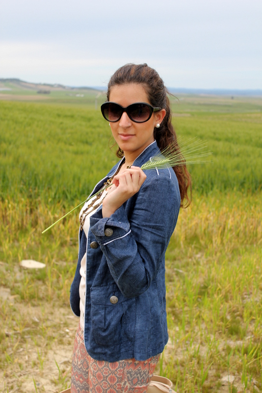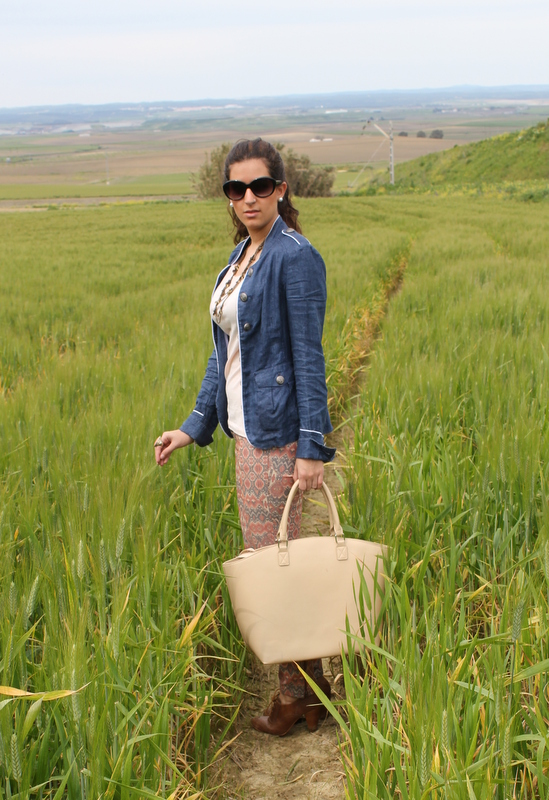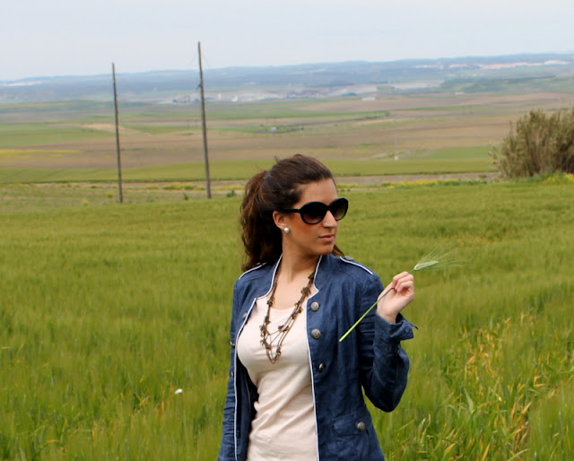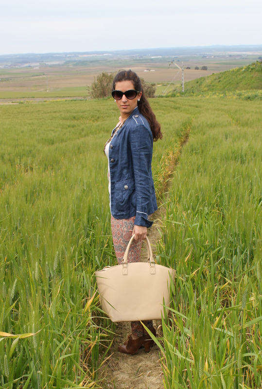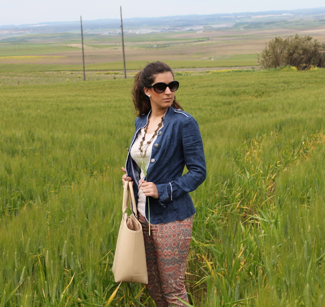¿Que tal amores? La primavera ya esta aquí y unas fotos con el campo como telón de fondo me parece la mejor manera de enseñaros el outfits de hoy. Tengo que reconocer que me lo pase genial haciendo las imágenes. El look es tanto para ir a la facultad como para salir a tomar un café con mis amigas. A los pantalones no les he dado el uso que esperaba y tienen un estampado complicado, la verdad. Me cuesta encontrarle alguna combinación que no sea una camiseta básica en tonos rosas o marrones o un chaleco de los mismos tonos si hace más frío, pero bueno seguiré intentándolo :). Para romper los tonos pastel me he decantado por una chaqueta de estilo navy, pero con unos algunos detalles militares, que le resta algo de protagonismo a los pantalones.