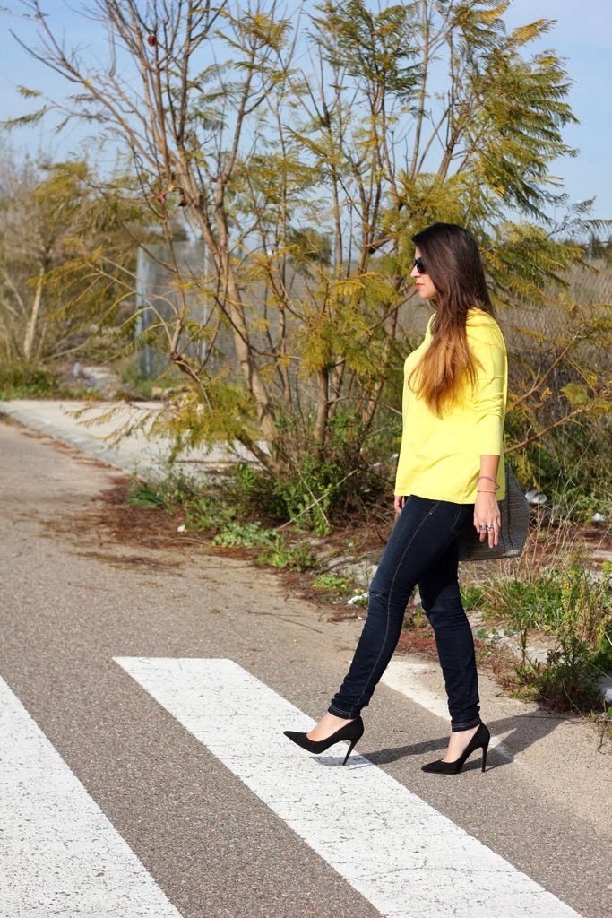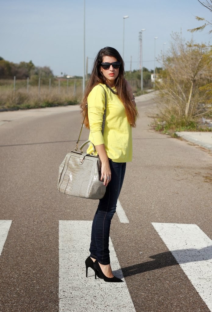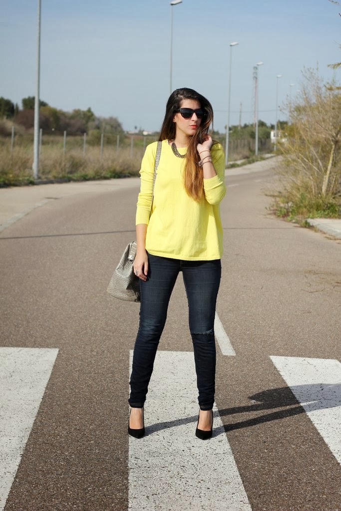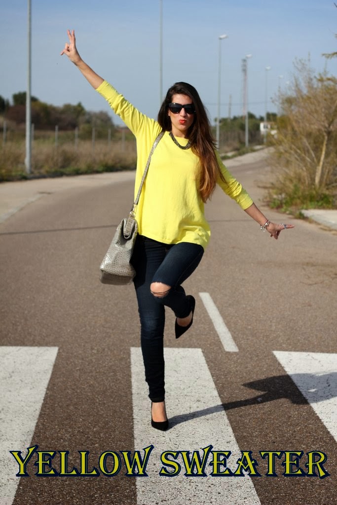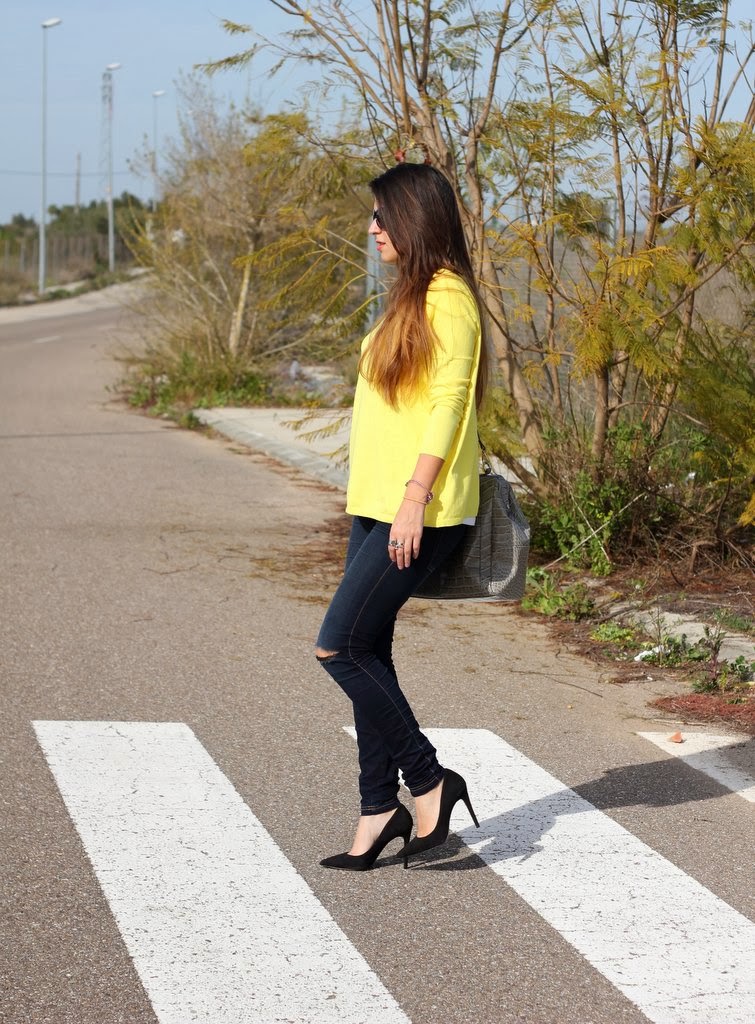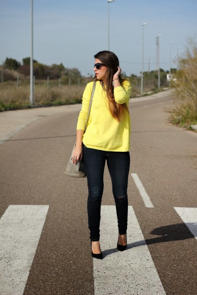 ¡Hola guapas! La primavera ya ha llegado a Sevilla y solo me apetece ponerme colores vivos, no suelo comprarme jerseys tan anchos pero cuando lo vi en Zara no pude resistirme, me encanta el color amarillo y a las que tenemos la piel morenita nos resalta muchísimo. Para no restarle protagonismo lo combiné con unos jeans rotos por la rodilla, mis stilettos negros y mi maxi bolso beige.